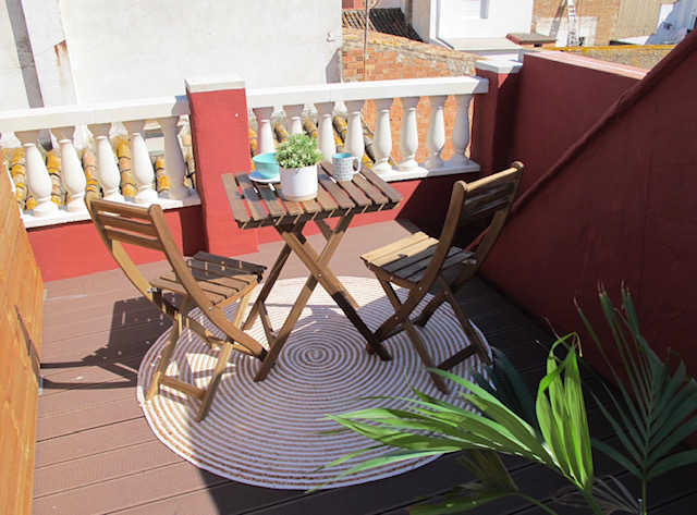 La suite Roof Top es el ático del edificio. 50m2 que comprenden habitación, baño y salón. También tiene una terraza privada con mesa y sillas desde donde disfrutar de las vistas de los tejados del barrio.