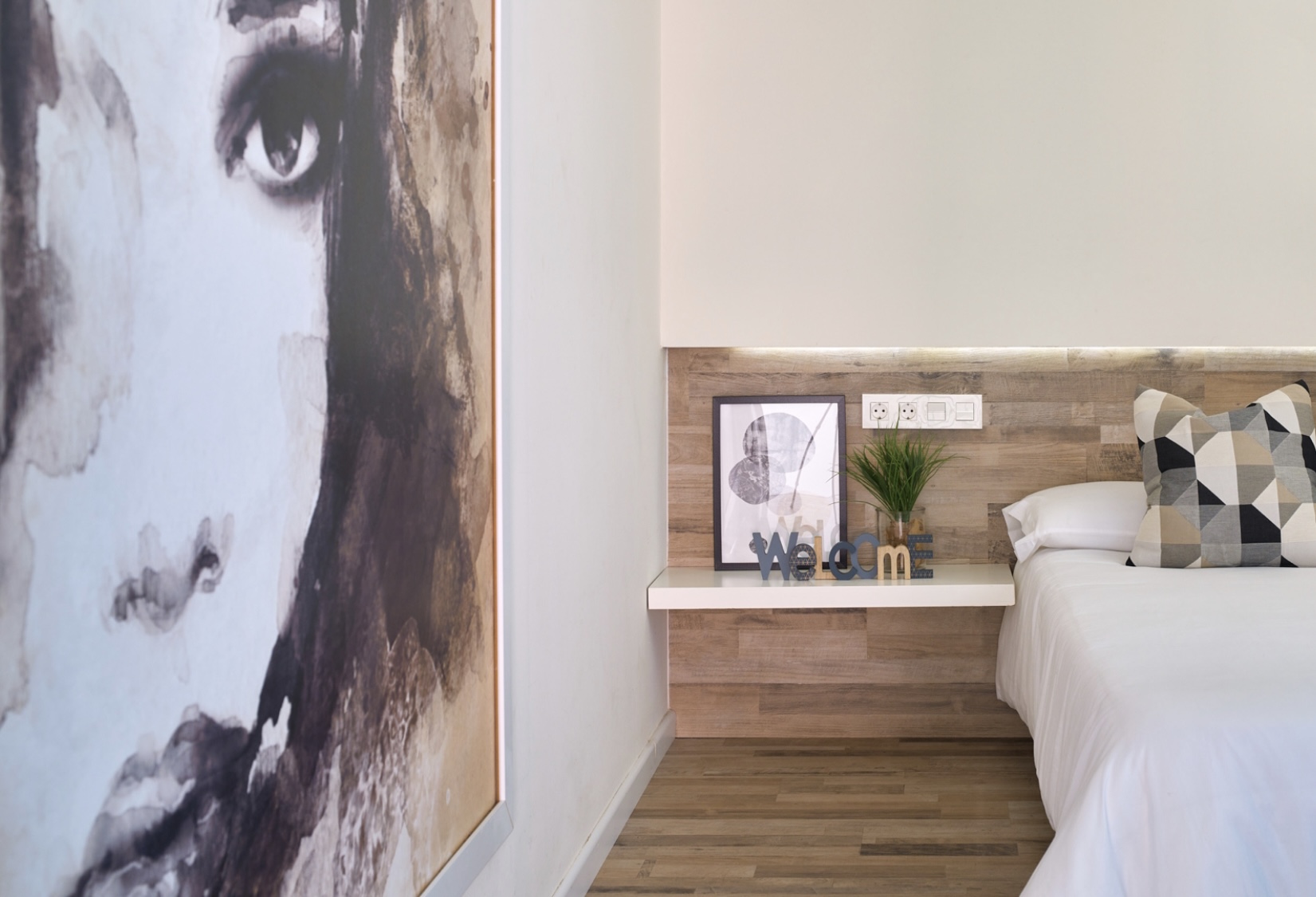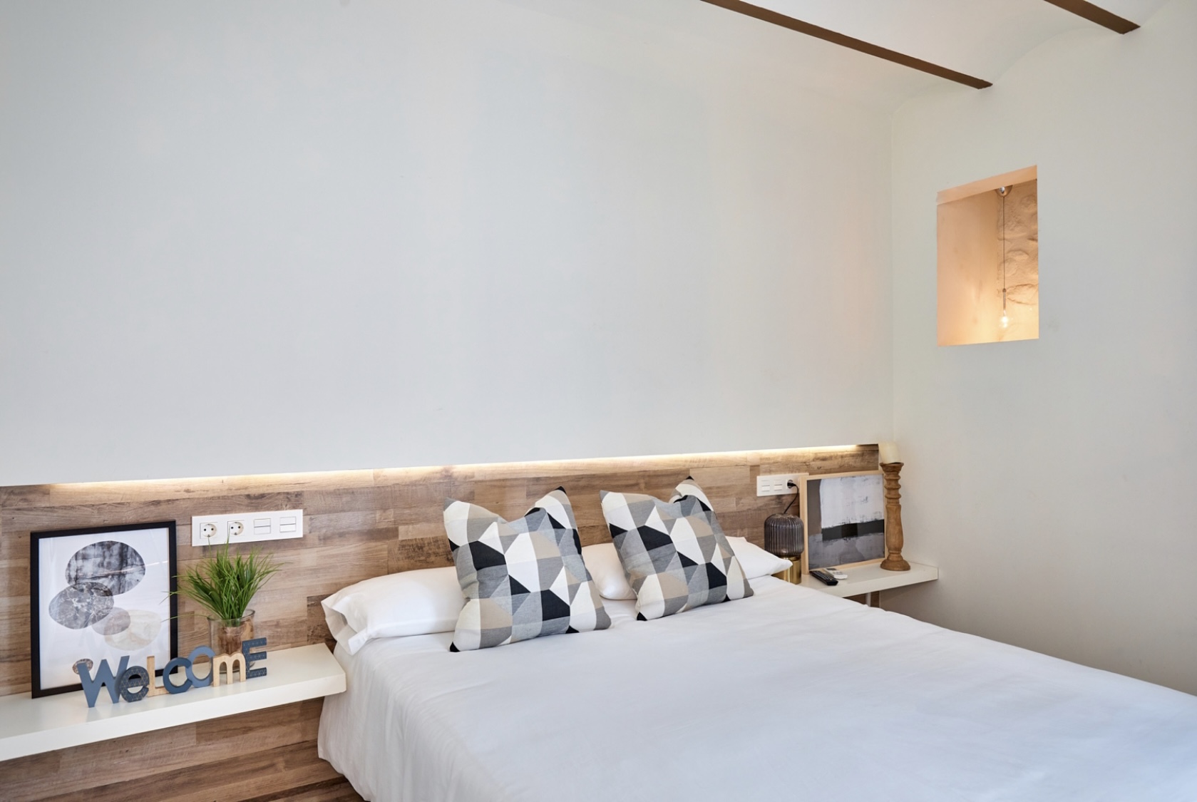 Nuestro primer alojamiento. Se halla en una casa completamente reformada del barrio histórico de Cambrils. Antigua residencia de un sacerdote, conserva dos hornacinas previstas para exponer imágenes y que ahora alberga parte de la iluminación automática del alojamiento.