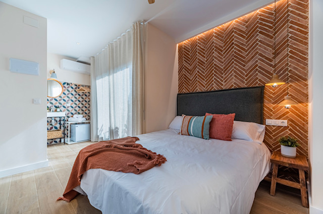 La suite Deluxe Patio es la más amplia, con 28 m², e incluye un patio privado de uso exclusivo, decorado con plantas y equipado con mesa y sillas. Orientado al sureste, es un rincón ideal para desconectar en un ambiente íntimo y agradable.